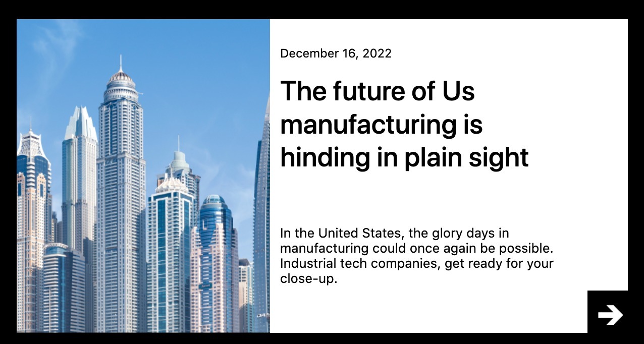 In the United States, the glory days in manufacturing could once again be possible. Industrial tech companies, get ready for your close-up.